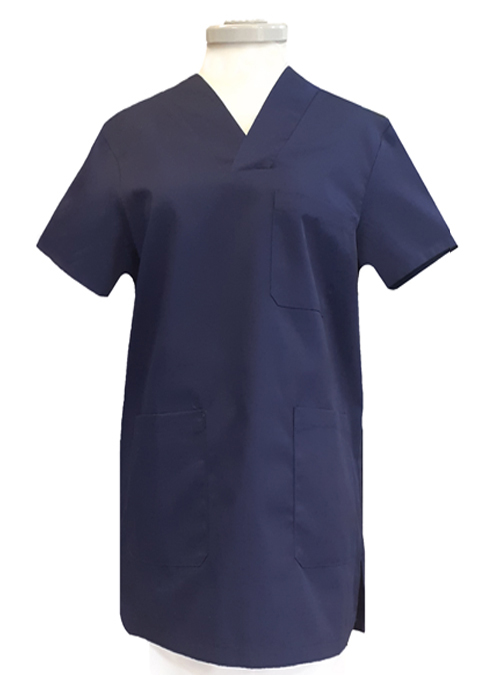 - Chaqueta Casaca Sanitaria manga corta unisex cuello pico, un bolsillo a la altura del pecho y dos bolsillos inferiores.